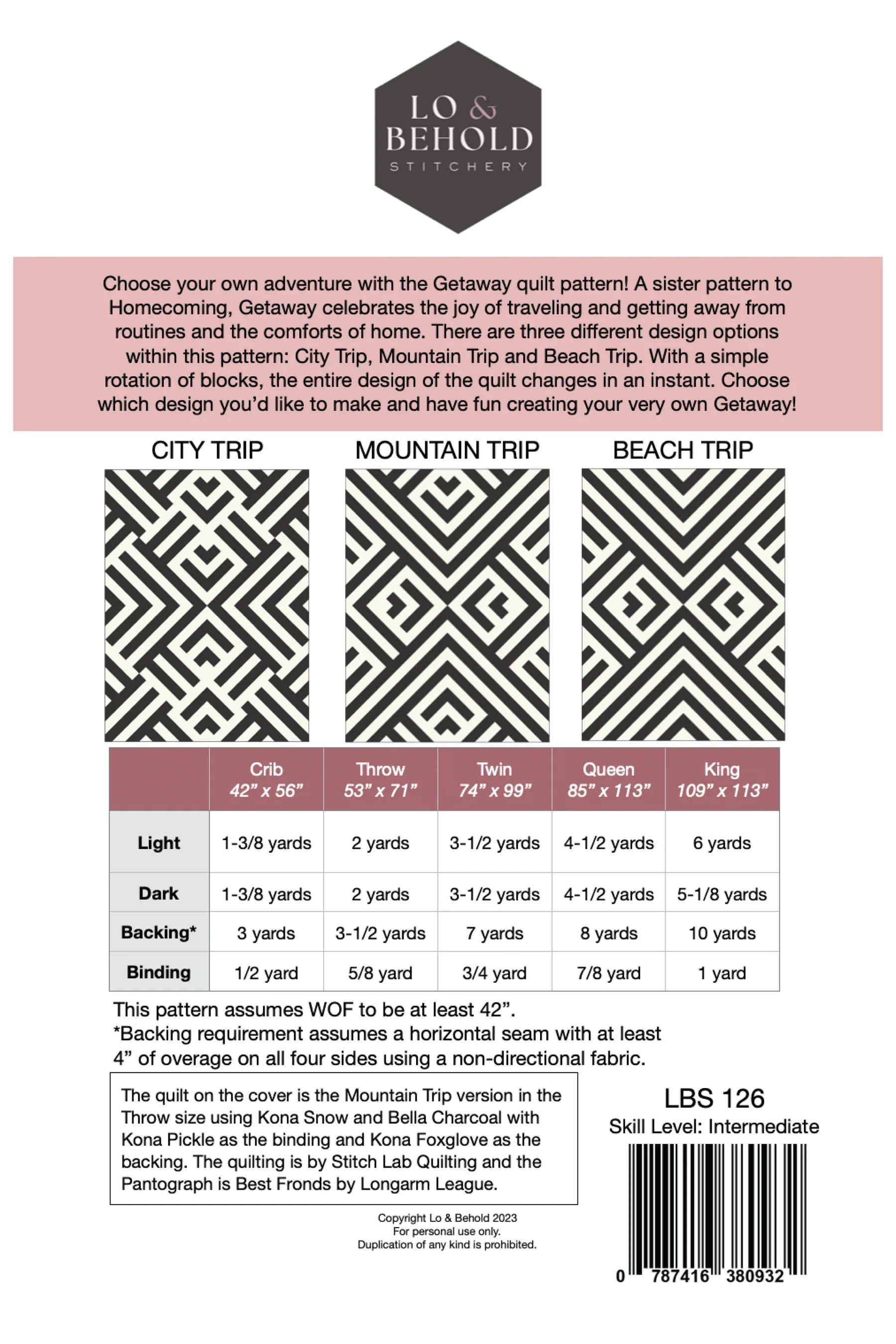 Choose an adventure with the Getaway quilt pattern! A sister pattern to Homecoming, Getaway celebrates the joy of traveling and getting away from routines and the comforts of home. There are three different design options within this pattern: City Trip, Mountain Trip and Beach Trip. With a simple rotation of blocks, the entire design of the quilt changes in an instant. Choose which design you’d like to make and have fun creating your very own Getaway! Choose from five different sizes ranging from Crib to King. This pattern includes 3 design options, helpful diagrams, thorough instructions, alternate color-way and quilting ideas, and a coloring page to plan your quilt. 5 sizes: Crib (42" x 56"), Throw (53" x 71"), Twin (74" x 99"), Queen (85” x 113") and King (109" x 113").